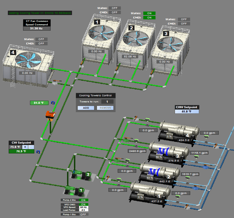 The new central plant was designed around four (4) 650 ton Trane Centrifugal chillers and included new pumps, VFDs, and Building Logix Niagara based controls. The design concept was for a variable primary flow system. However, due to time, cost, and space restrictions the hospital elected to not replace the existing piping. Because the existing piping was configured for a primary/secondary configuration, this was potentially problematic. The problem was resolved by installing VFDs on the primary pumps and modulating the speed based on flow rate through the de-couple bridge.